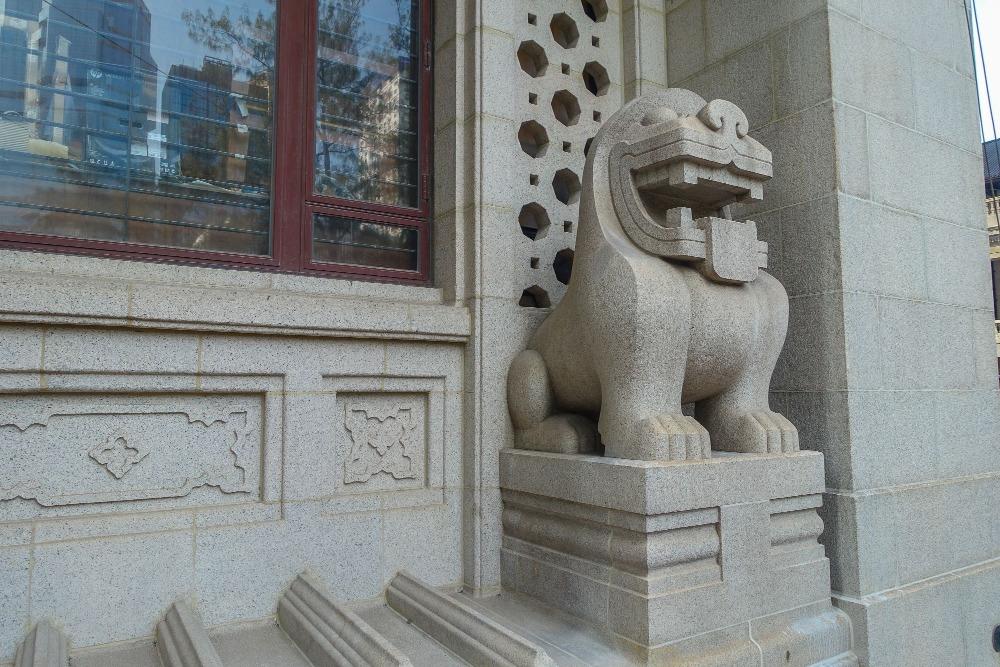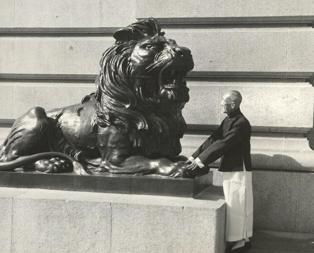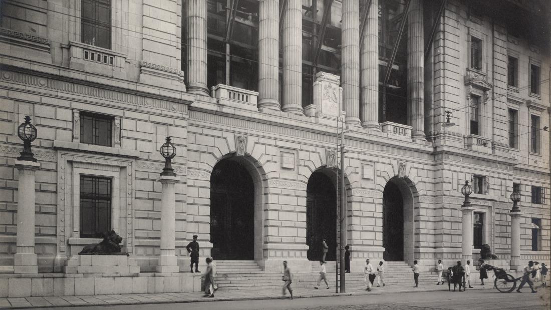 中國本身並無獅子,根據傳媒引述,最早的獅子於漢代以貢品的形式由西域傳入中國,被視為祥瑞的象徵。圖為舊中銀總行門前的傳統石獅。從其把玩繡球的前爪可以辨識出它為雄獅。(圖片來源:香港大學圖書館)