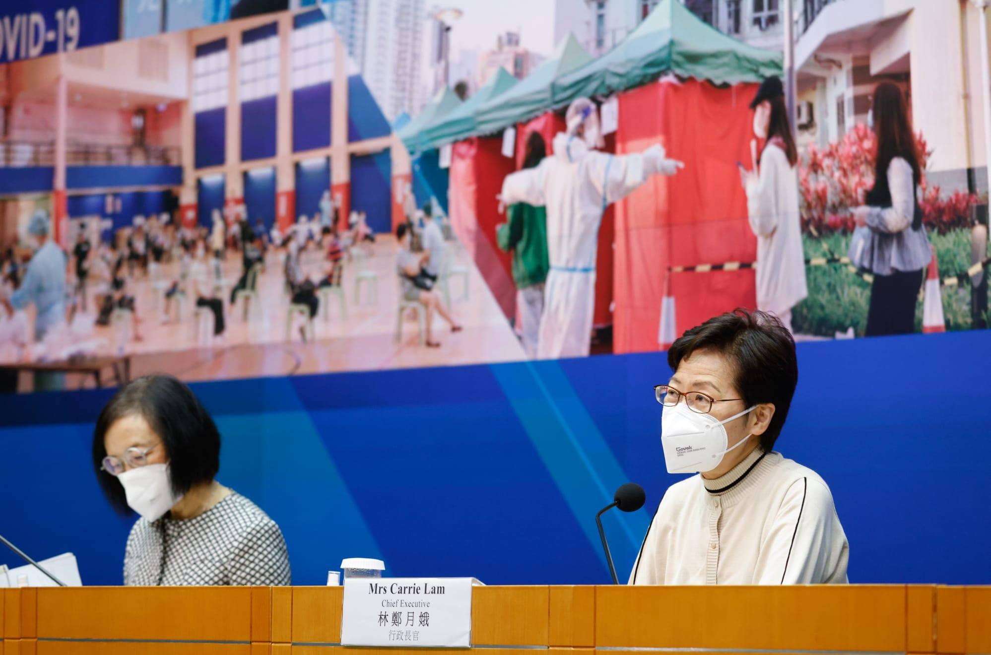 食物及衛生局長陳肇始(左)及特首林鄭月娥(右)。(蘇文傑攝)