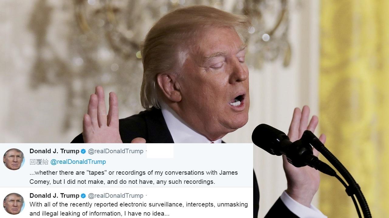 返回 本地 2017-06-23 18:10:00 特朗普承認無錄下與科米談話 分享: 美國總統特朗普於5月9日開除科米後,曾說過科米最好希望沒有二人私下談話的錄音,暗示他有不利科米的秘密錄音,幾周來外界一直敦促他證明。特朗普今天於Twitter承認,他沒有錄下與聯邦調查局(FBI)前局長科米(James Comey)的談話,也未持有任何相關錄音帶。 特朗普指:「最近有關電子偵測、攔截、揭密和非法洩露資訊的報道」、「我不知道我與科米的談話是否有『錄音帶』或錄音,但我沒有做任何此類錄音,也未持有它們。」