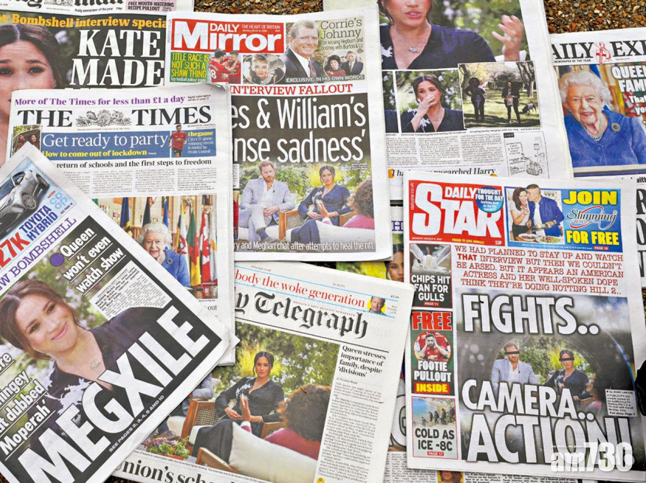 英國報章紛頭版報道亨利夫婦的專訪。(美聯社)