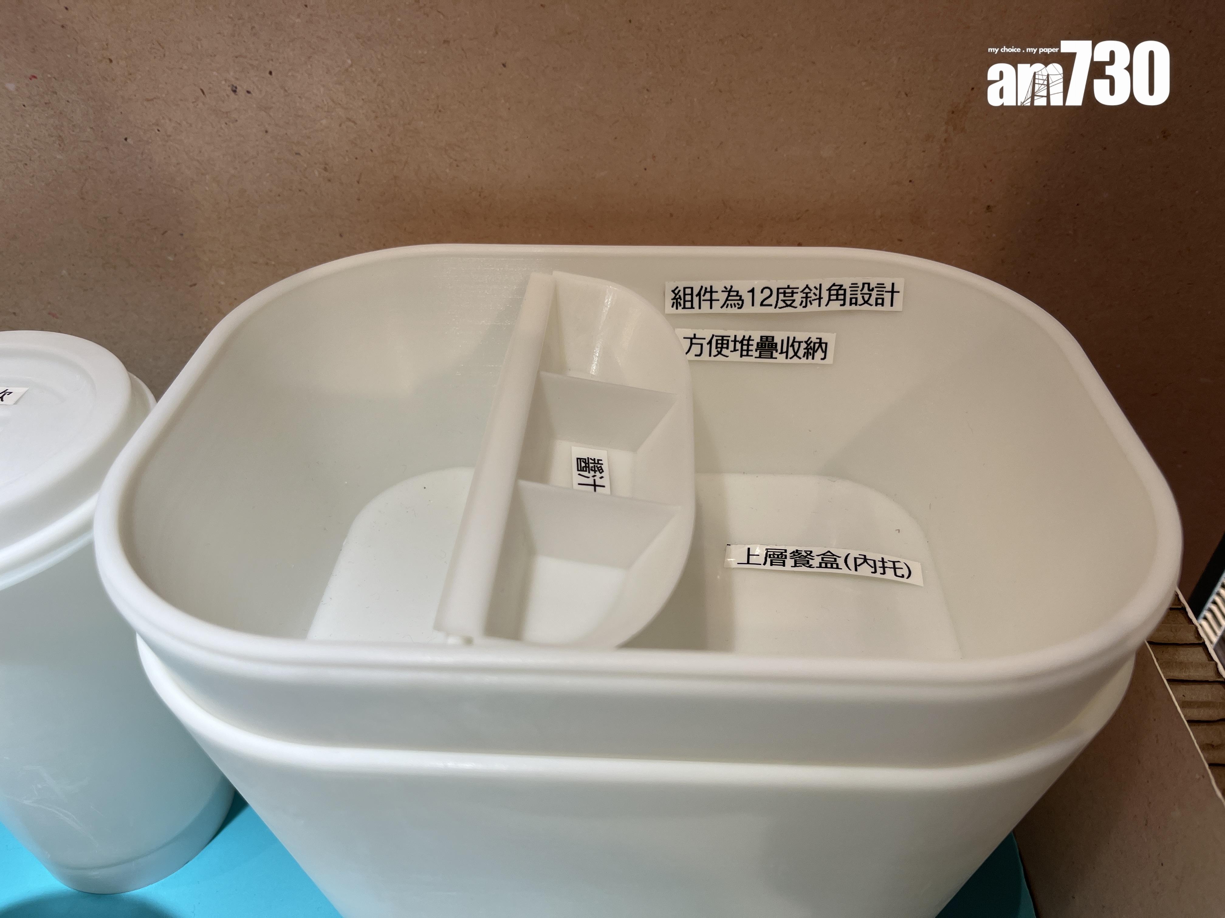 梅綽玲介紹,餐盒分為蓋子、中間分層和底盒,上下兩層可堆疊或獨立使用;蓋子則上下兩層都適用。她分享設計方案僅花兩、三個月,須平衡外觀、容量、實用、普及和方便度等各方面因素,難度頗高。她希望未來能改善餐具的硬度、大小等,讓作品可應用到真實生活,協助香港逐漸走塑。