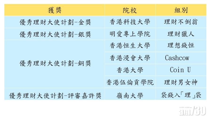 榮獲「個人理財大使計劃 2020/21 ─ 優秀理財教育計劃獎 ─ 金獎」為香港科技大學(科大)團隊,隊員包括:陳思慧、林筱珊、陳樂欣、陳思雅及陳澤謙。團隊取名「理財不倒翁」,寓意投資理財雖然「有起有落」,但同學們只要保持個人財務健康,即使遇到任何財務危機,亦能夠站穩陣腳,沉著應對。