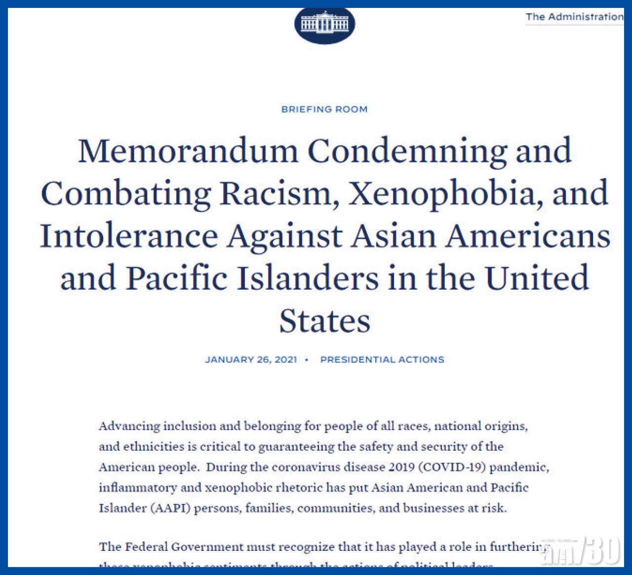備忘不點名提到,「聯邦政府必須明白一些政治領袖的行動,加劇了仇外情緒,包括以源頭的地理位置(the geographic location of its origin)來稱呼新冠肺炎疫情」,指有關說法加劇了針對亞裔及太平洋島國裔民眾的欺凌、騷擾及仇恨罪案,指示各聯邦部門引以為鑑。有評論認為,儘管備忘中沒有指名道姓,但矛頭明顯指向前總統特朗普以及其「中國病毒」(China virus)、「武漢病毒」(Wuhan virus)和「kung flu」言論。
