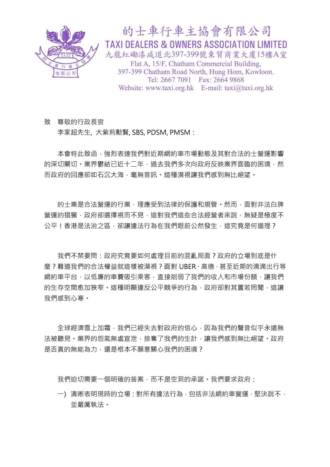的士車行車主協會函特首促打擊白牌車 否則採取進一步行動