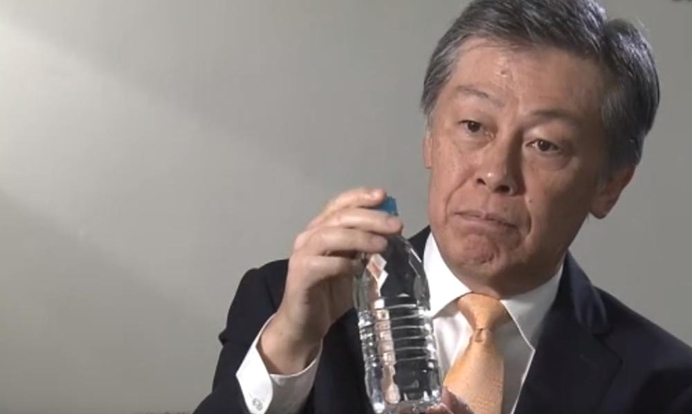 他以樽裝水來解釋,指重點不是氚是否存在,而是是否合乎安全標準。(電視截圖)