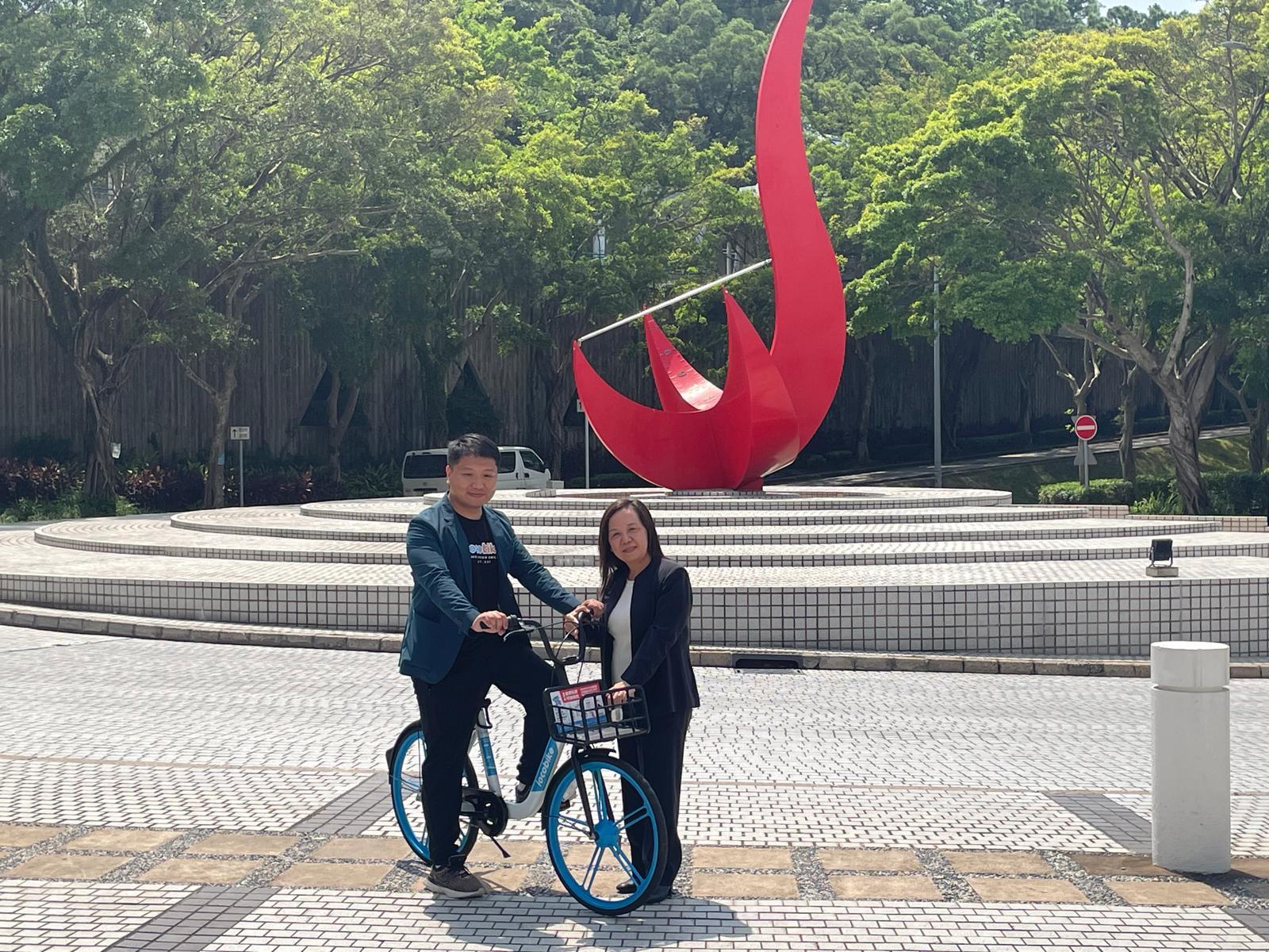 (左起)程俊豪、易靄儀,研究將展開8星期的調查,擬訂香港「幸福單車指數」。(陳家莉攝)