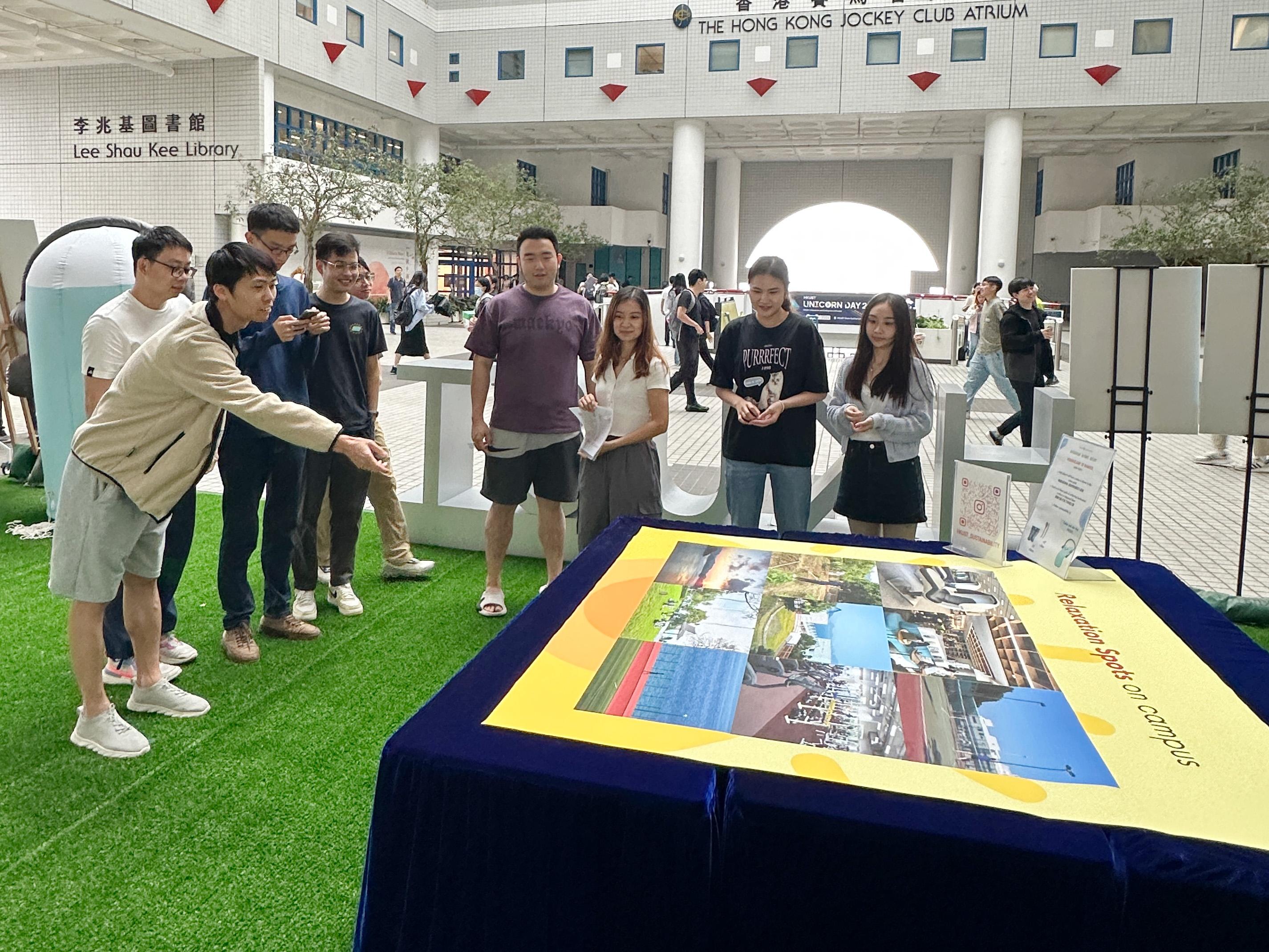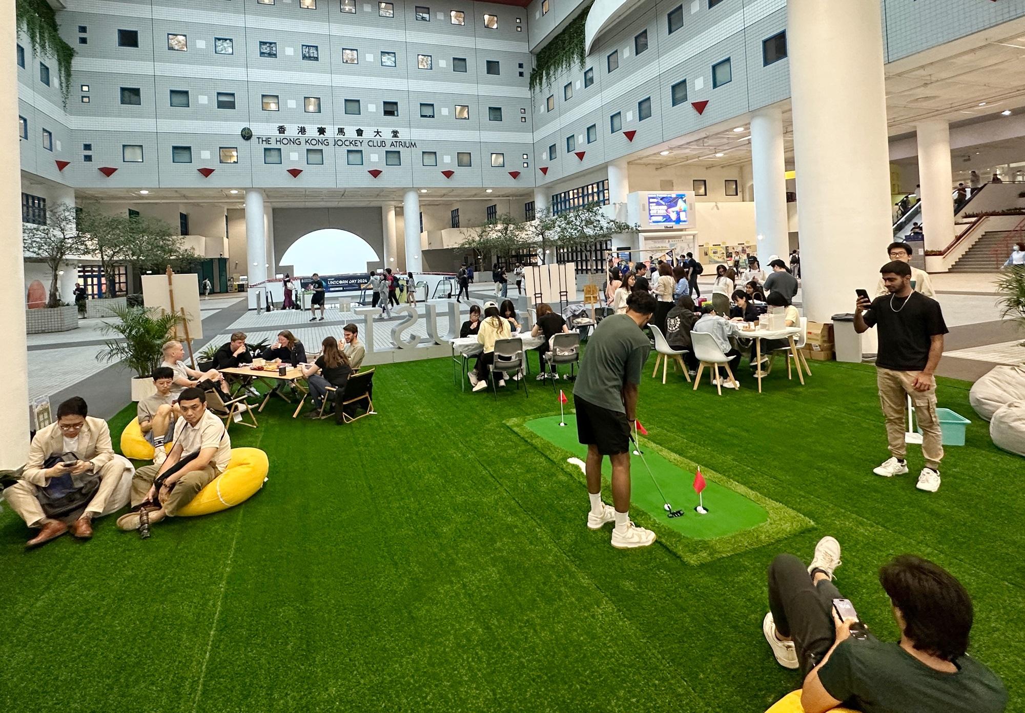 正值考試期間,香港科技大學科大自本周一起舉辦「Recharge · Refuel · Relax」考試周活動,將香港賽馬會大堂改造成「放空角落」,舖上大片綠色草地,並添置多個豆袋梳化及迷你高爾夫體驗區,既鼓勵同學努力備試,亦可抽空和其他同學見面傾談,從而釋放壓力。
