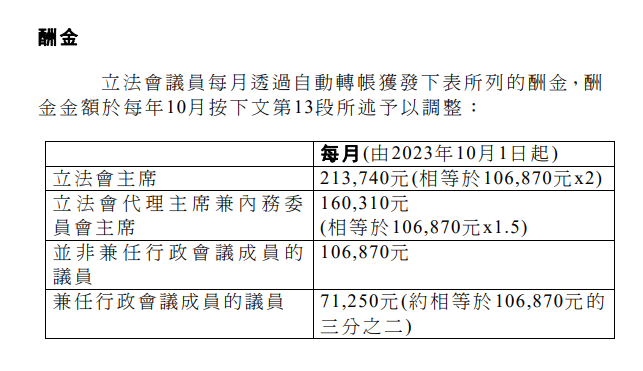 由港府向立法會提交的文件透露,立法會議員薪酬按機制,每年按丙類消費物價指數變動調整,薪酬將由目前104,880元,增至106,870元,即每月加1,990元,加幅約1.9%,加幅追溯至今年10月1日。