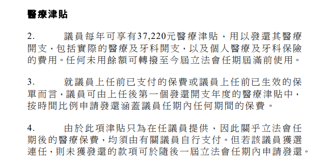此外,一眾立會議員亦可享有37,220元醫療津貼,較去年的36,530元,稍增690元;營運開支償還款額方面,辦事處營運則每年增加54,670港元,即達到2,932,080港元。