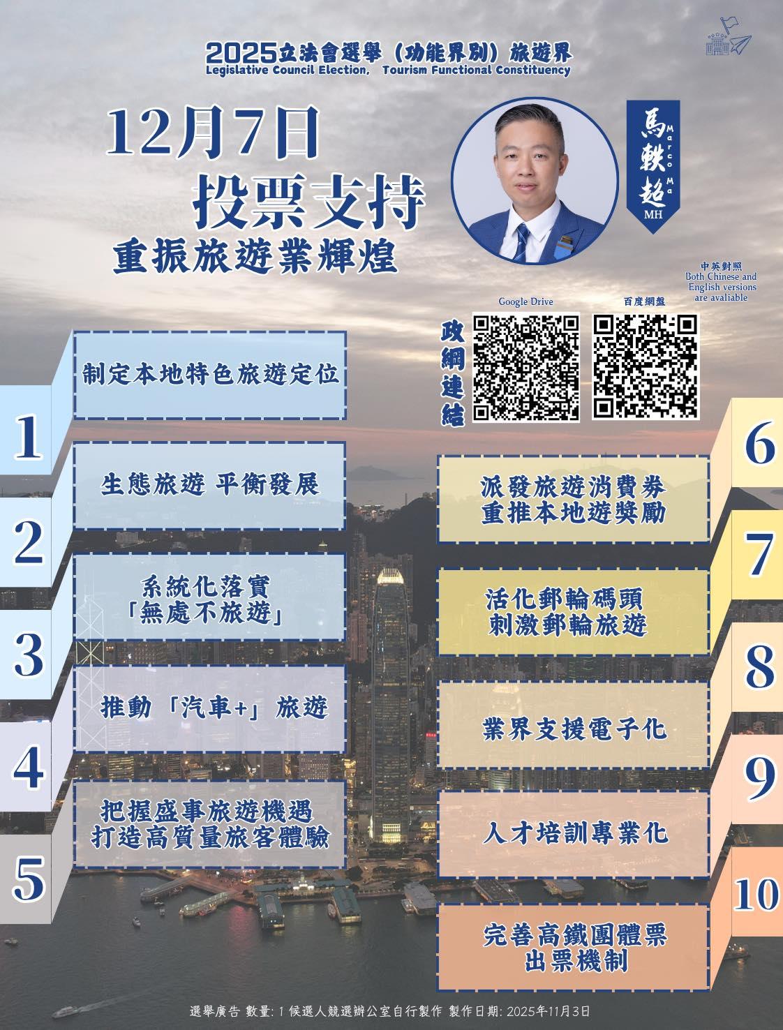 旅遊界另一候選人是觀塘區議員馬軼超,報稱自己為遊學教育有限公司董事總經理。他在社交平台發佈十大政綱初稿,口號是重振旅遊業輝煌。(馬軼超FB)