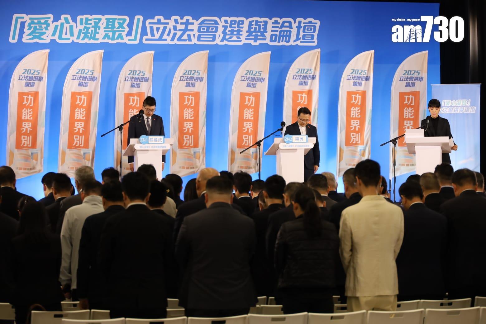 論壇開始時,主持人請大家起立,為大埔宏福苑死者默哀1分鐘,論壇並取消原有的打氣環節。在三條必答題中,有兩條問題有關救災支援、災後重建。爭取連任的候選人陳勇指,所屬的界別被形容為「國家隊」,在今次大火發揮對外的整合能力,多個愛國團體捐款,形容是「人未到,錢已經打入香港政府戶口」。
