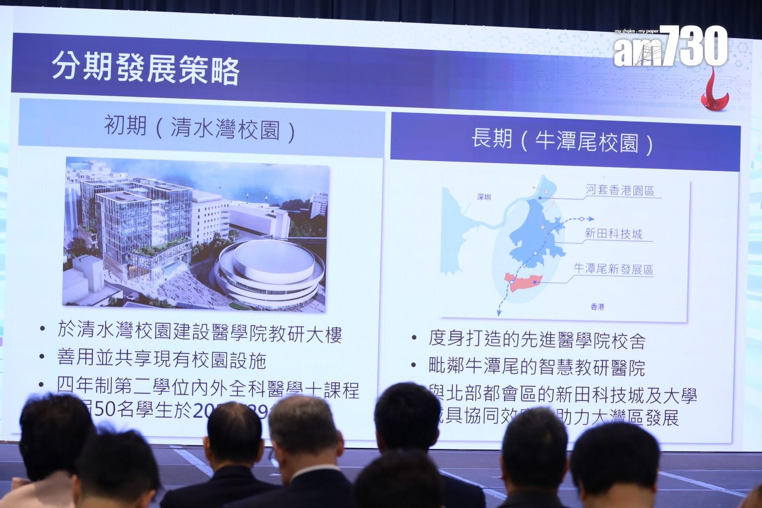 葉玉如指出,科大儲備非常雄厚,新醫學院將分期發展,初期將自資超過20億元在清水灣校園建設醫學院教研大樓,善用並共享現有清水灣校園設施;長遠而言,科大將在牛潭尾度身打造醫學院校舍,毗鄰智慧教研醫學醫院。而政府會承擔教資會對課程的恆常資助外,亦會資助將來在牛潭尾醫學院校舍的部分興建費用。