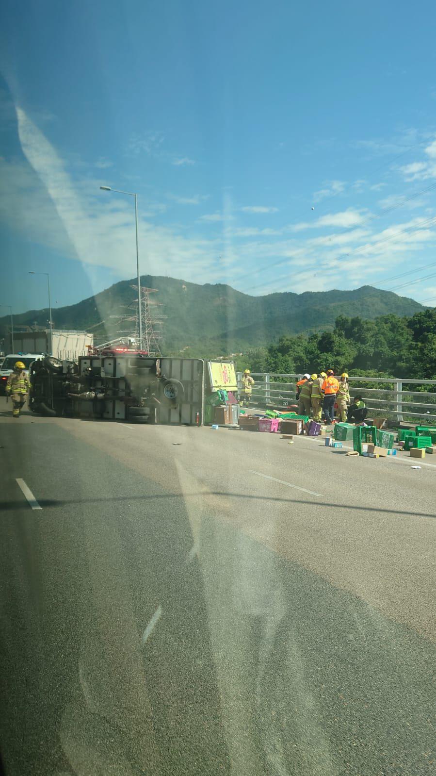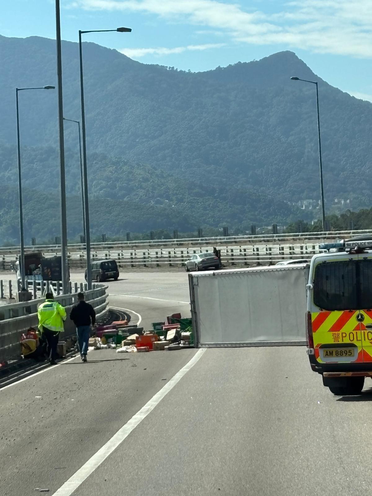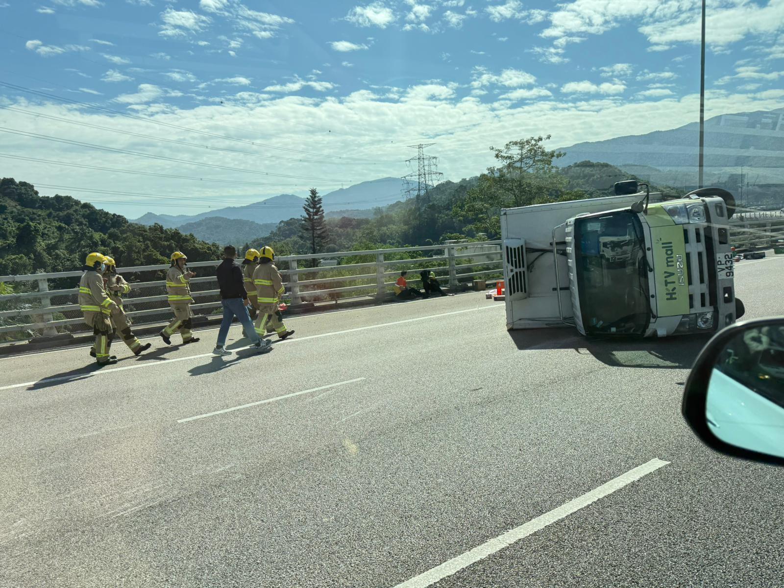 粉嶺公路一輛HKTVmall貨車發生交通意外。(fb「馬路的事討論區」圖片)