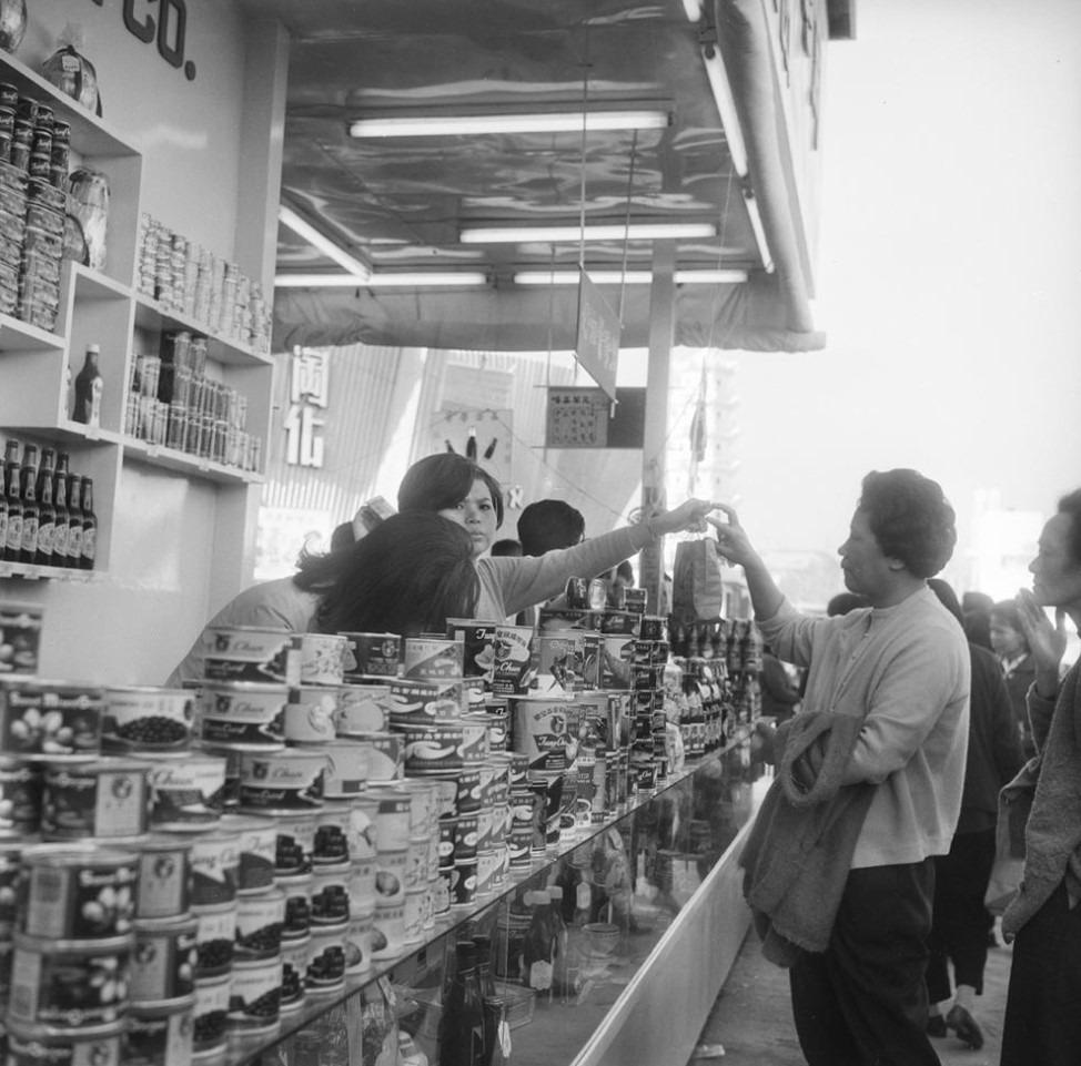 圖為1967年市民於第25屆香港工業出品銀禧展覽會同珍醬油罐頭攤檔買罐頭的情況。(圖片來源:香港記憶/政府新聞處)