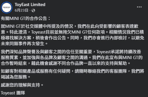 在今年6月,另一模型品牌MINI GT宣布,終止向Tiny微影及東方玩具有限公司(Toyeast Limited)批發供貨及業務往來,指其持續發生付款問題,近期情況更為嚴重。東方玩具則回應表示,目前並無拖欠MINI GT任何款項。根據東方玩具的網站,Tiny微影為東方玩具的自家品牌。