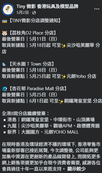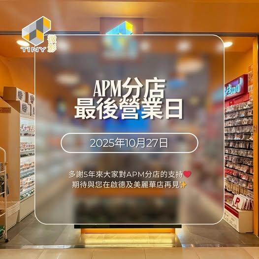 本地模型品牌Tiny微影在社交媒體上公布,於10月8日關閉元朗Yoho分店後,周一(20日)再公布觀塘APM分店將於下周一(27日)結束營業,成為今年第8間結業的分店。Tiny表示,觀塘APM的分店因租約期滿,下周一為店舖最後營業日,又提及荃灣新店將於11月初開幕,亦將會有元朗新店的消息公布。