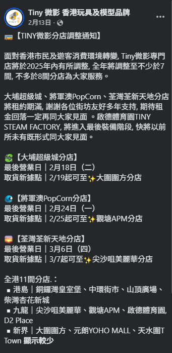 本地模型品牌Tiny微影公布觀塘APM分店將於下周一結束營業。(Facebook@Tiny微影)