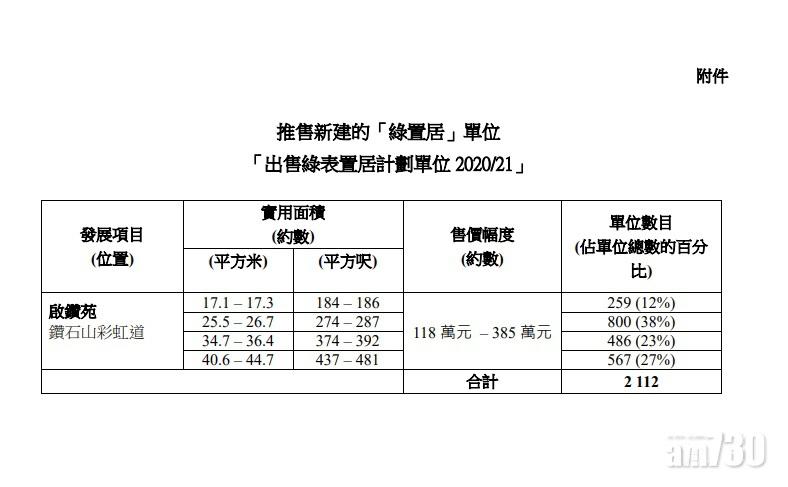 在 「綠置居2020/21」下發售的單位包括鑽石山啟鑽苑2,112個單位,單位實用面積由約17.1平方米至約44.7平方米不等;「綠置居2019」未售出的523個單位,包括柴灣蝶翠苑七個單位及青衣青富苑516個單位,單位實用面積由約17.4平方米至約17.6平方米不等;截至選樓日期開始前約兩個月確知額外因買賣協議撤銷而收回的「綠置居2019」單位;以及約800個「租置計劃」回收單位。