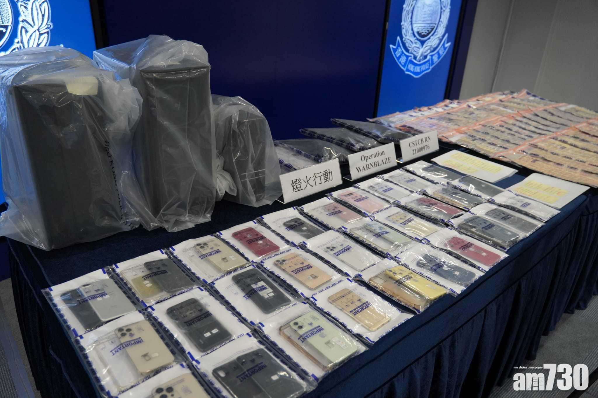 警方展示在行動中檢獲的大量現金及多部電話。(莊振邦攝)