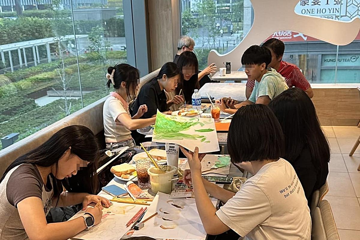 啟德一間快餐店今日有一群年輕人畫畫,桌上亦有一些食物和飲品。(FB群組「啟德居民自由講~」)