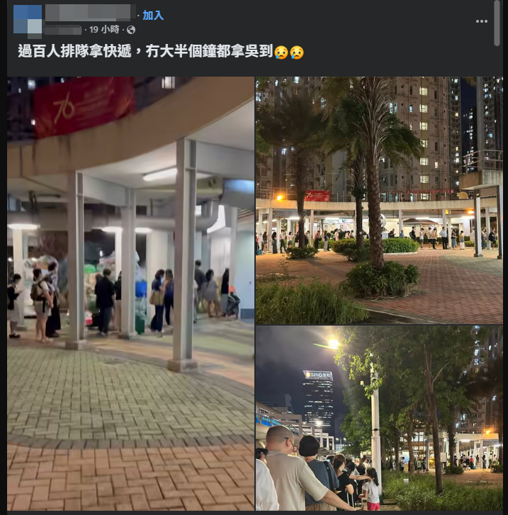近日有網民在社交平台發文分享,指有過百人在啟德德朗邨的自提點排隊拿取快遞。(啟德居民自由講~Facebook)