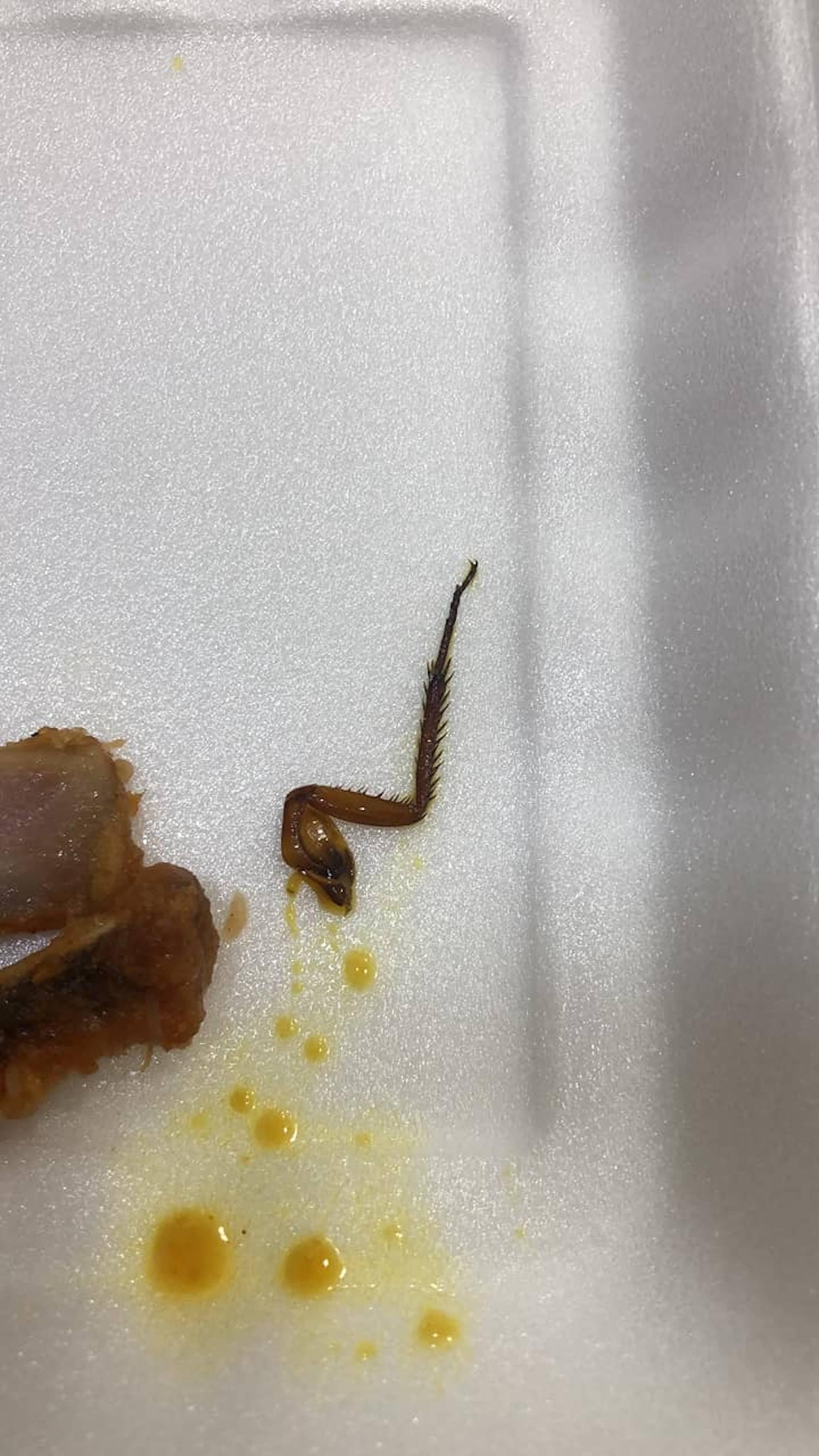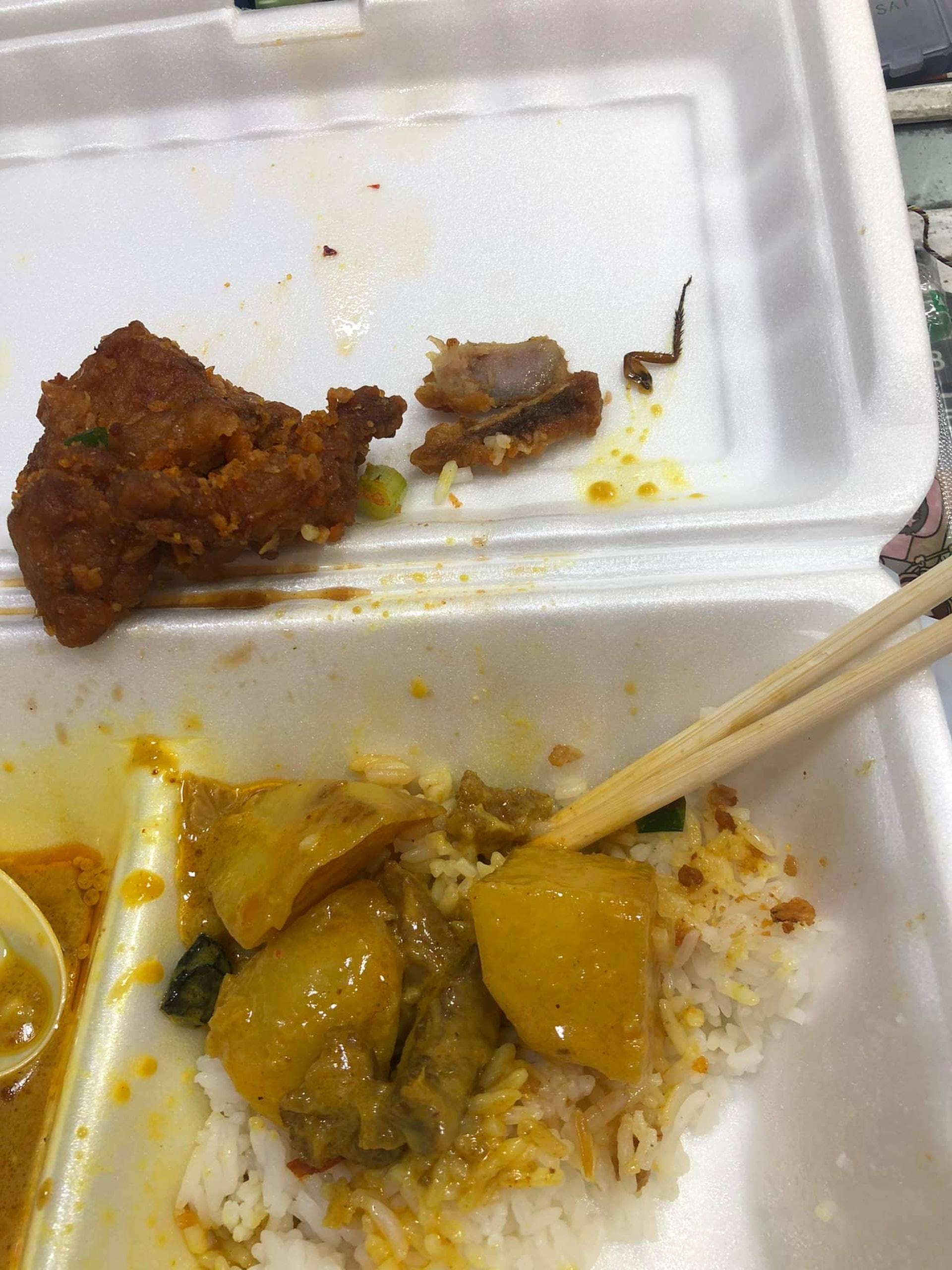 而從圖片可見,該盒兩餸飯只剩下少量飯菜,而沾滿咖哩汁的蟑螂殘肢,則被挑出放於盒蓋上。只見該蟑螂腳肌肉線條明顯,感覺強而有力,「腿毛」則根根分明,充滿光澤。