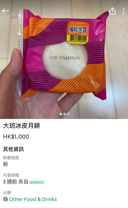 樓主近日於社交平台Threads發文稱,「老媽子呻話今年無得食大班冰皮月餅,日日喺度哦我」,他「為咗盡孝道,即刻諗辦法去搵」,最終於網上買賣平台Carousell發現有數名賣家出售大班冰皮月餅,當中一名賣家三周前發布告示可見他手頭上有芒果、楊枝金露、藍莓味的月餅,叫價高達1000元,另有賣家更以「絕版」形容月餅,叫價400元,惟已列明「已過食用日期」。