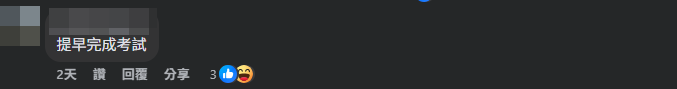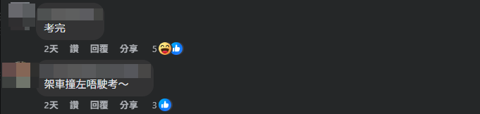 有網民問及會不會是最快完結的駕駛考試,有網民則分享自己經驗指,「唔會,我未出學院已經肥左」,亦有網民指,「鴨駕(港島安全駕駛中心)場入面有唯一一支紅綠燈,有人喺場入面衝紅燈,未開始已結束」。