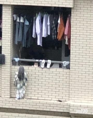 窗外發現對面大廈有人危站屋簷下,應如何處理?內地有網民分享「哈哈哈學校的白牆裡看到的……」,上載了一張相片是一名長髮披肩但只有小童高度、身穿格仔長裙的人站在露台外牆邊緣。