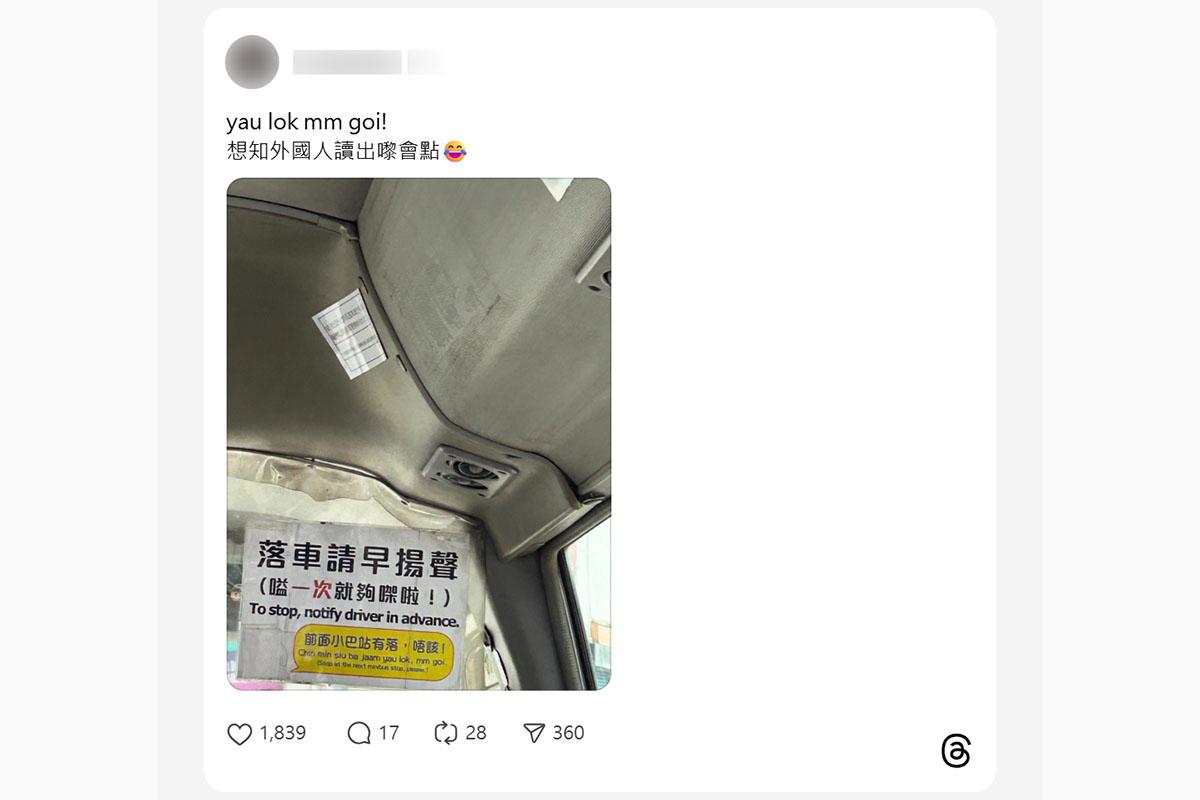 在社交平台分享該中英對照的小巴通告的網民,亦跟隨通告風格表示「yau lok mm goi!(有落唔該!)」,笑言「想知外國人讀出嚟會點」。有留言讚賞通告有創意,「第一次見到英文版,犀利」、「又幾有水平WO(喎),哈哈」,亦有人指出外國人看通告後「咪照讀英文嗰行囉。」另一邊廂,有網民就分享日常搭小巴叫落車的不快,「嗌咗有落啲小巴佬成日都唔舉手,都唔知佢聽唔聽到,有啲嗌完冇舉手佢又識停,但係有時就飛站,同佢講仲話返你冇嗌。」