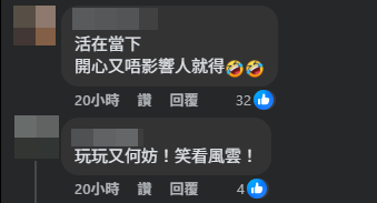 該影片引起網民熱議,對男子的行為表示,「活在當下,開心又唔影響人就得」、「玩玩又何妨!笑看風雲!」、「開心就好」。有網民調侃,「瞓上去扮小龍女姑姑吖嘛」、「呀叔肯定覺得跌落水無跌落地咁痛」。