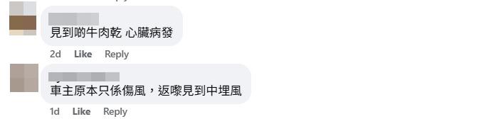 有部份網民則調侃,「出咗院見到咁嘅樣又要入院」、「車主原本只係傷風,返嚟見到中埋風」、「(車主)見到啲『牛肉乾』心臟病發」。