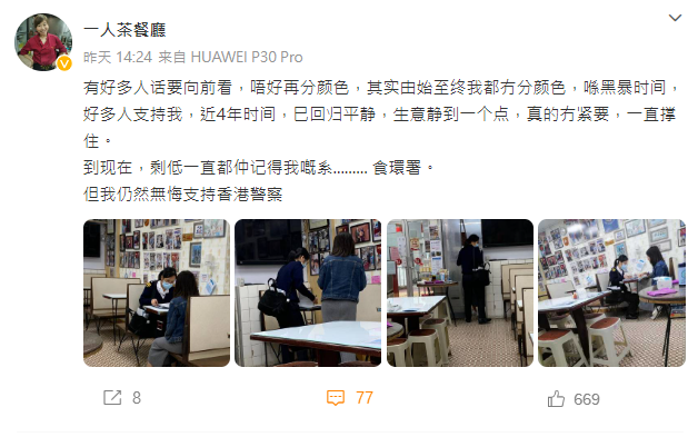 撐警「銀龍咖啡茶座」老闆娘嘆生意冷清,稱自己「由始至終都冇分顏色」。(微博@一人茶餐廳)