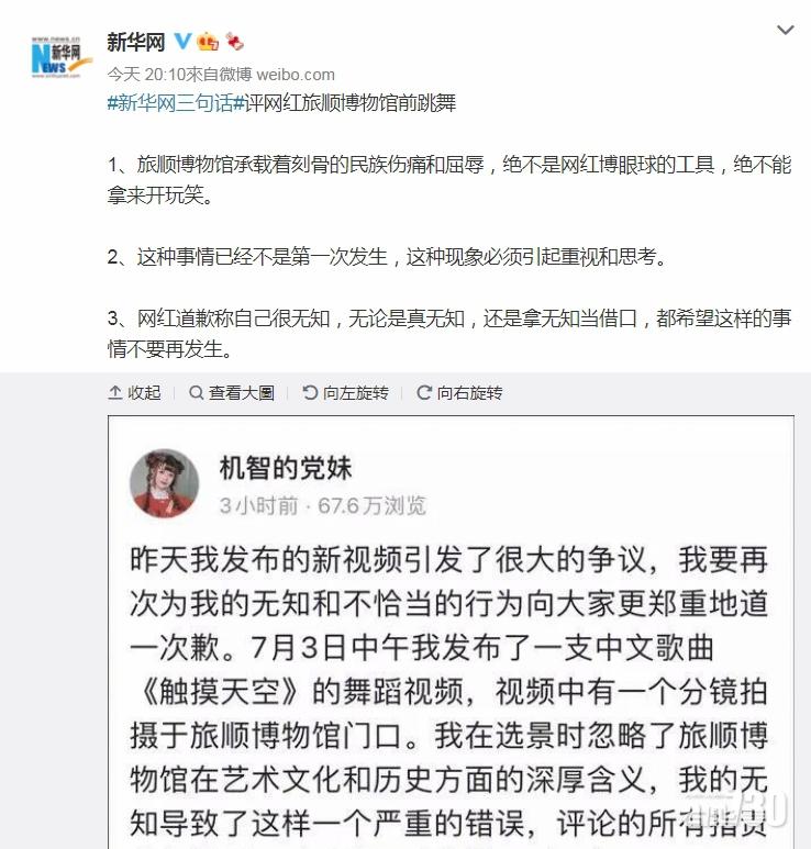 中央政法委微信公眾號昨日也轉發相關報道以示關注,新華網昨晚更在微博評論事件,稱「旅順博物館承載著刻骨的民族傷痛和屈辱,絕不是網紅博眼球的工具,絕不能拿來開玩笑」,強調「這種事情已經不是第一次發生,這種現象必須引起重視和思考」,並認為「無論是真無知,還是拿無知當藉口,都希望這樣的事情不要再發生」。