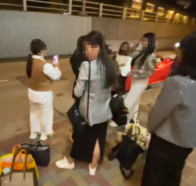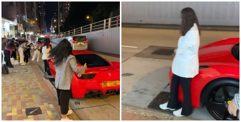 影片可見,一輛紅色法拉利跑車停泊於亞皆老街路邊,吸引大批人圍觀影相,一行衣着打扮光鮮的男女約十多人,聽到是操普通話的內地人。其中一名女子在車旁附近與跑車自拍,另一位穿白色西裝的女子則依靠在法拉利車頭,同行人士幫忙拍照,樓主配文「前世未見過跑車」。