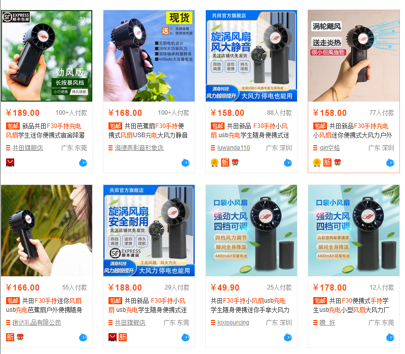 《AM730》到淘寶搜尋過有關貨品,發現類似的手提風扇在淘寶屬熱賣貨品,而且價格不一,在150元至189元人民幣(折合約169至213港元)區間;淘寶上說明指出,該電風扇以USB充電,有4檔風力調節。