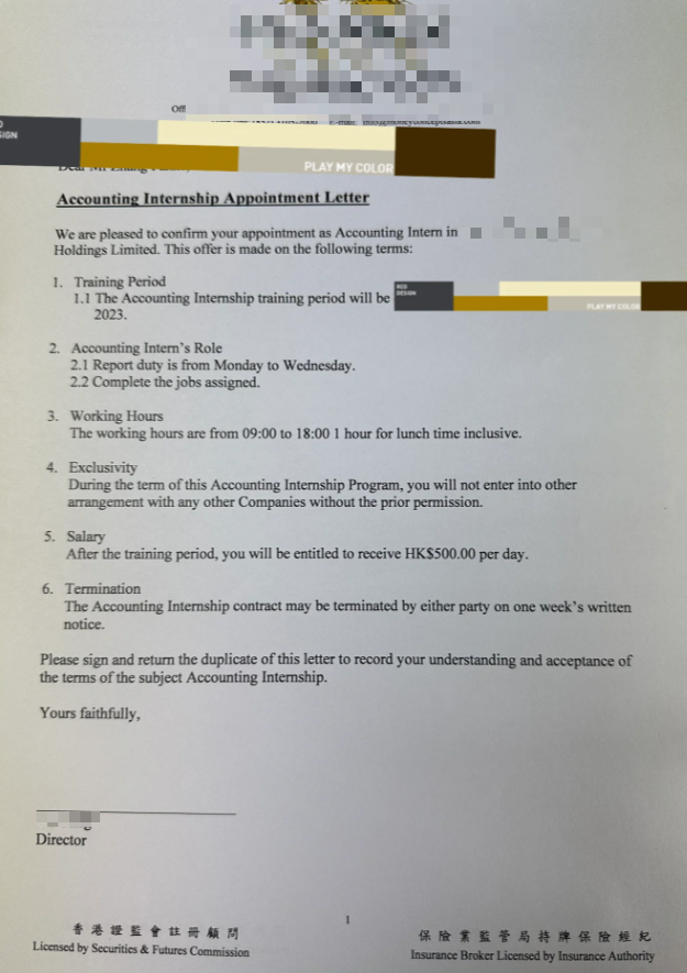 最後港漂工作逾一星期方通知簽合約,甚至在簽合約時,才發現實習前的培訓是沒工資,他指公司當時沒有提,「白干幾天,問了負責人之後直接跑」。又重申當時在招聘網站上,招聘廣告寫明是一日500元薪金,又呼籲網民多多注意一下該公司。根據該位港漂貼出的照片可見,合約寫明培訓後,每天可獲500元薪金。