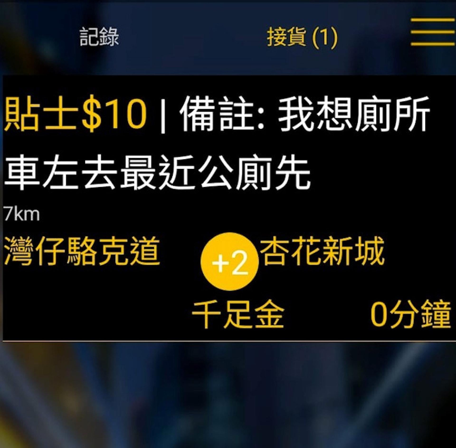 不過,該名乘客在備註欄中提出另類要求,表明會另付10元「貼士」,要求額外增加中途站,「我想(去)廁所,車咗去最近公廁先」,待解決需要後才繼續駛至目的地,的士司機笑言,相關訂單是「近期見過最癲嘅要求」。