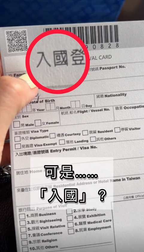 內地女赴台灣旅遊怒撕「入國申請表」
