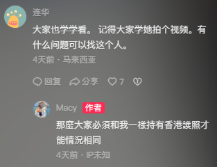 雖然「Macy」怒撕該「入國登記表」,但她仍能順利從高雄入境台灣,並表示會展開為期4天的台灣之旅。她其後回覆,因自己早年已移居香港,並持有香港護照,故不需填寫該「入國登記表」亦可順利入境台灣。