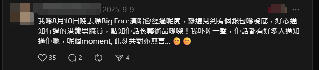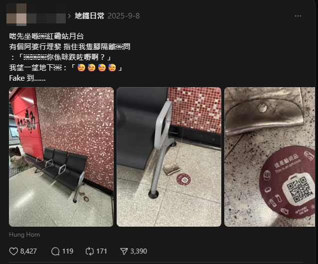 有網民在社交媒體分享,指自己坐在紅磡站的椅子上,有位婆婆走過來並指地上的銀色銀包造型的藝術品並問,「你係咪跌咗嘢啊」。該網民直言,「Fake 到……」。「銀色銀包」引起網民熱議,不少網民表示自己也曾經被這件藝術品騙了。
