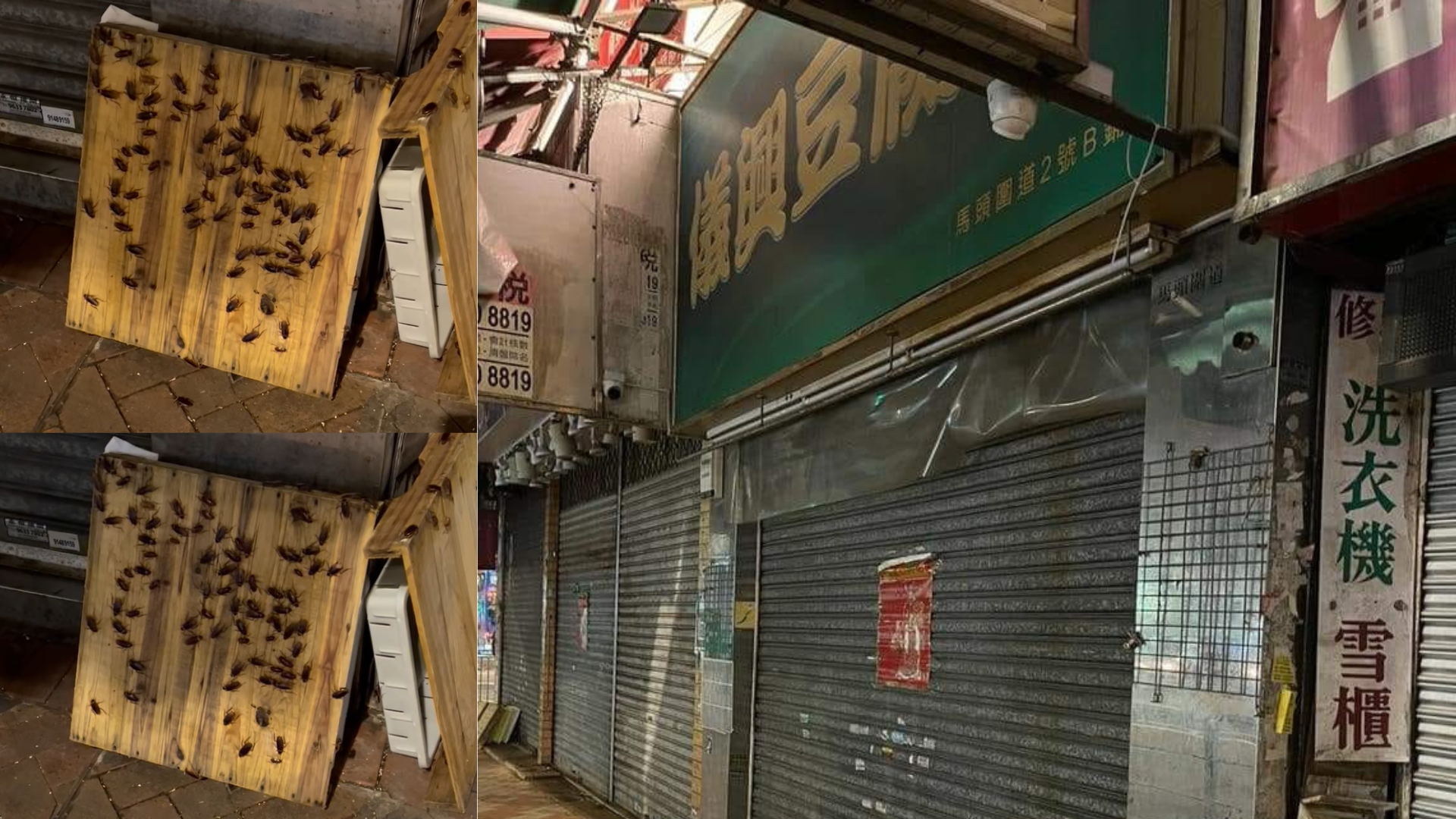 有網民於Facebook專頁「To Kwa Wan 土瓜灣之友」上截照片,只見一間已經打烊、疑名為「儀興豆腐」的豆腐舖門外,放置了兩件木板及膠盤,其中一塊木板上竟爬滿逾近百隻蟑螂曱甴聚餐;而另一個木板上亦有數隻蟑螂爬行,十分驚人。