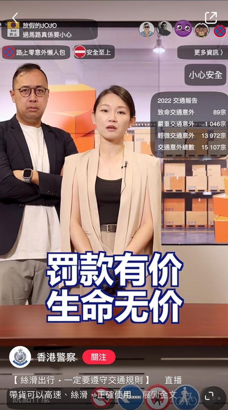 11月初,香港警察在其官方小紅書帳號上,上載一則影片宣傳遵守交通規則,並寫道,「直播帶貨可以高速、絲滑,正確使用道路也一樣。不論是司機還是行人,時刻守法忍讓,這樣出行就最暢通無阻!如果不遵守交通規則,被帶走的不止金錢,還有可能是寶貴的生命。記着罰款有價,生命無價。」