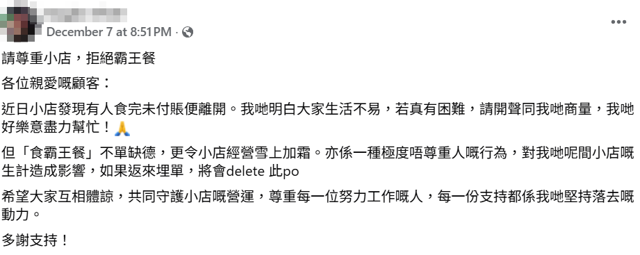 該間米線店的高層近日在facebook群組「沙田/馬鞍山之友」發帖,寫道:「請尊重小店,拒絕霸王餐」,指發現一名女食客用餐後未有付款便離開,並呼籲:「我哋明白大家生活不易,若真有困難,請開聲同我哋商量,我哋好樂意盡力幫忙!但食霸王餐不單缺德,更令小店經營雪上加霜。亦係一種極度唔尊重人嘅行為,對我哋呢間小店嘅生計造成影響,如果返來埋單,將會delete 此po。希望大家互相體諒,共同守護小店嘅營運,尊重每一位努力工作嘅人,每一份支持都係我哋堅持落去嘅動力。」