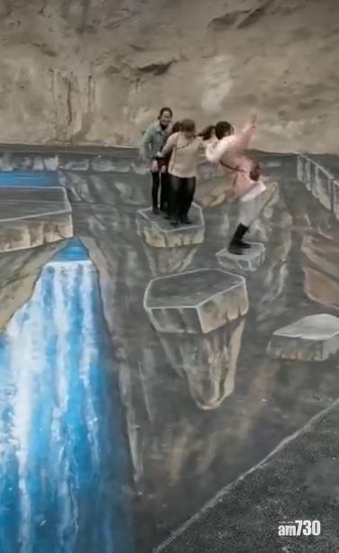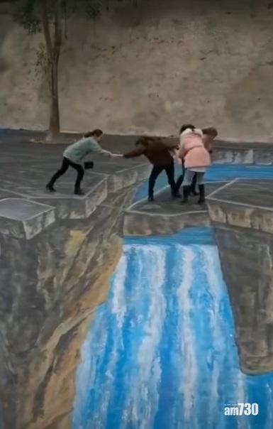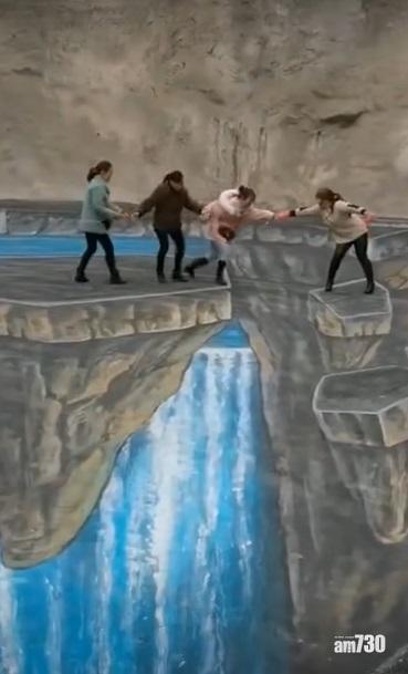 3D立體畫令平面畫作「動起來」,內地網民分享一條短片,一幅在地上繪製的大型瀑布加浮石的3D立體畫,4名婦人跨越多塊「浮石」往彼岸,其中一名穿高根鞋的婦人更一馬當先跨越障礙,若遇上「浮石」之間有較大罅隙,她們更會守望相助,手拉住拉手協助同伴跳過,部分行到較細的「浮石」上,曾似失平衝,身軀微微出現搖晃,而最終4人均能平安跨過瀑布上的所有浮石群。