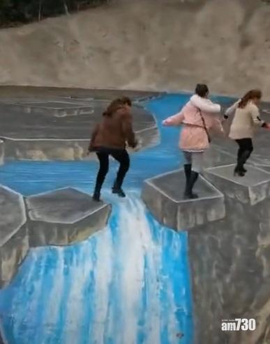 網上熱話|4名阿姨跨越3D立體畫瀑布  網民︰戲假情真
