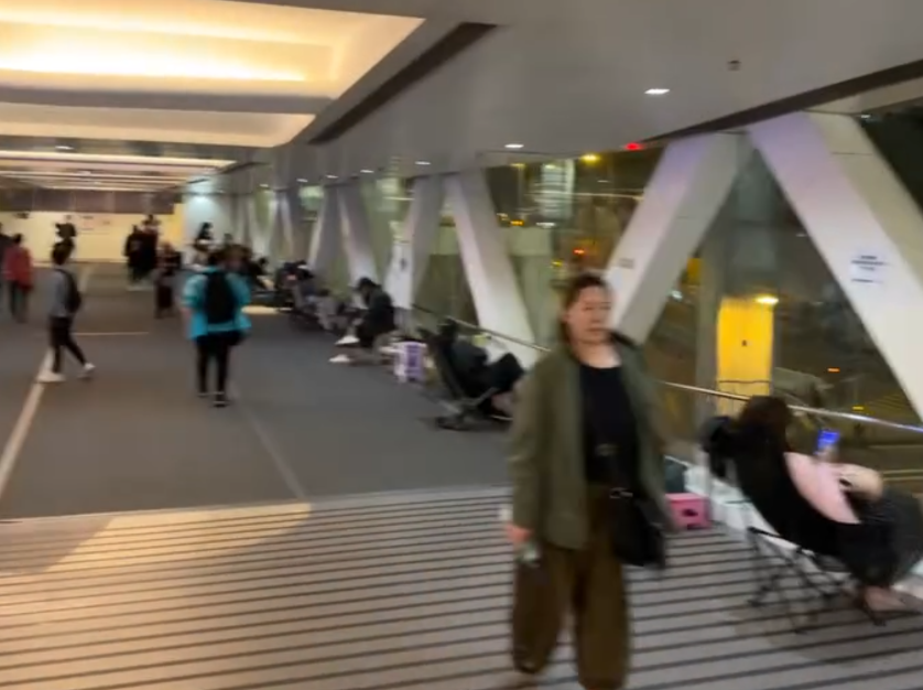 觀塘apm商場附近的天橋上度出現奇怪人龍,不少人更自備露營椅「長期作戰」,引發網上熱議。(Threads影片截圖/X官塘老X群組FB)