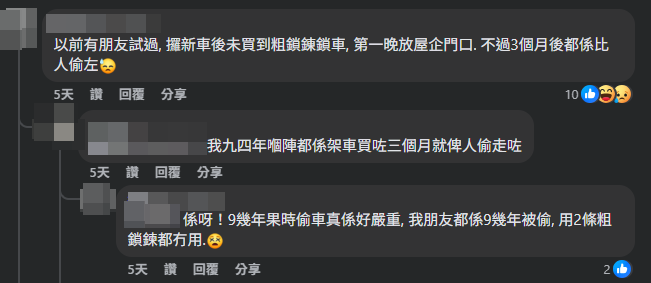 有網民表示90年代偷車問題嚴重,不少車主將電單車帶回家中,以防被盜,有網民表示,「94年嗰陣都係架車買咗三個月就俾人偷走咗」、「我朋友都係9幾年被偷,用2條粗鎖鍊都冇用」。有網民提及,「我老友試過推架大包圍返屋企,打斜都入唔到電梯」。
