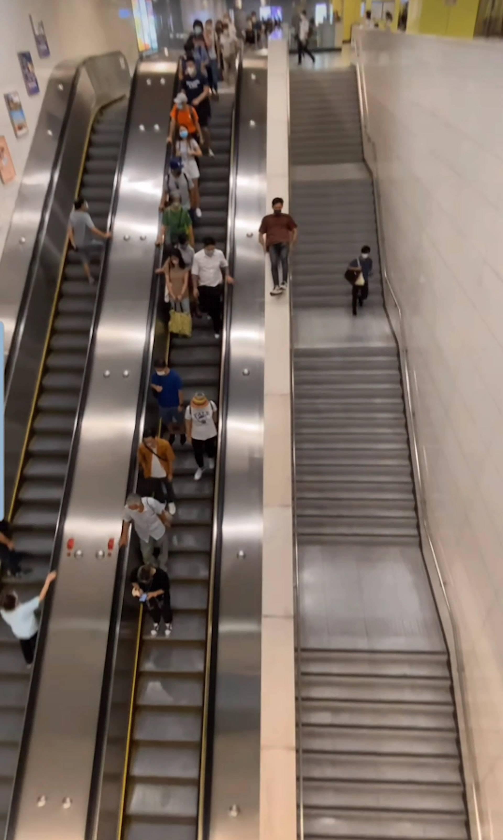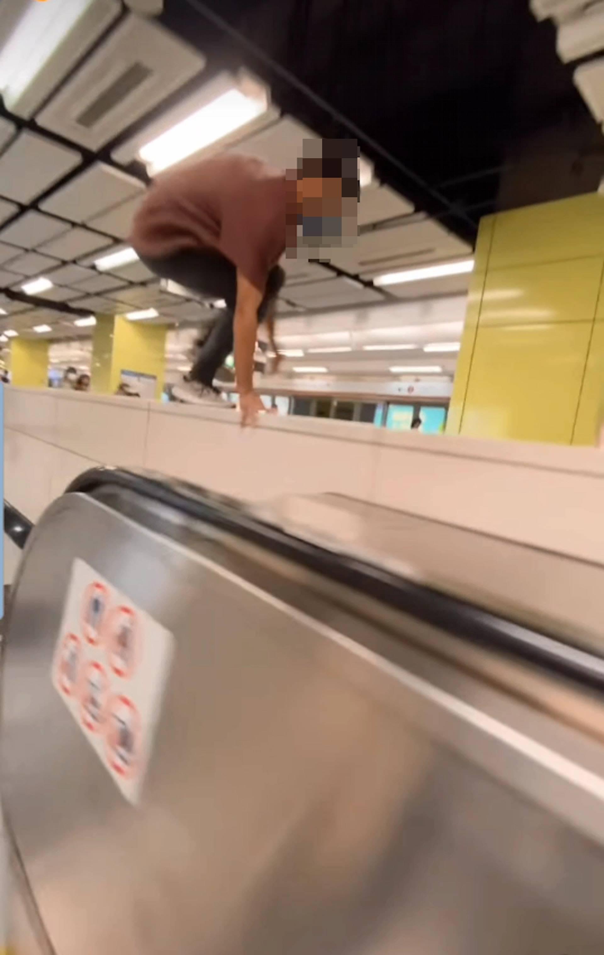 其中一條片段,只見該男子從約2、3層樓,高約10米的扶手梯頂瀡到地面。另一條片段則見,該男子先助跑,然後跳上扶手電梯旁的斜台,然後如瀡滑梯般瀡落地面,到梯台盡頭後跳落地離開,助跑連離開全長不過10秒。,旁邊的途人並無太大反應,近日獲多名網民轉載。