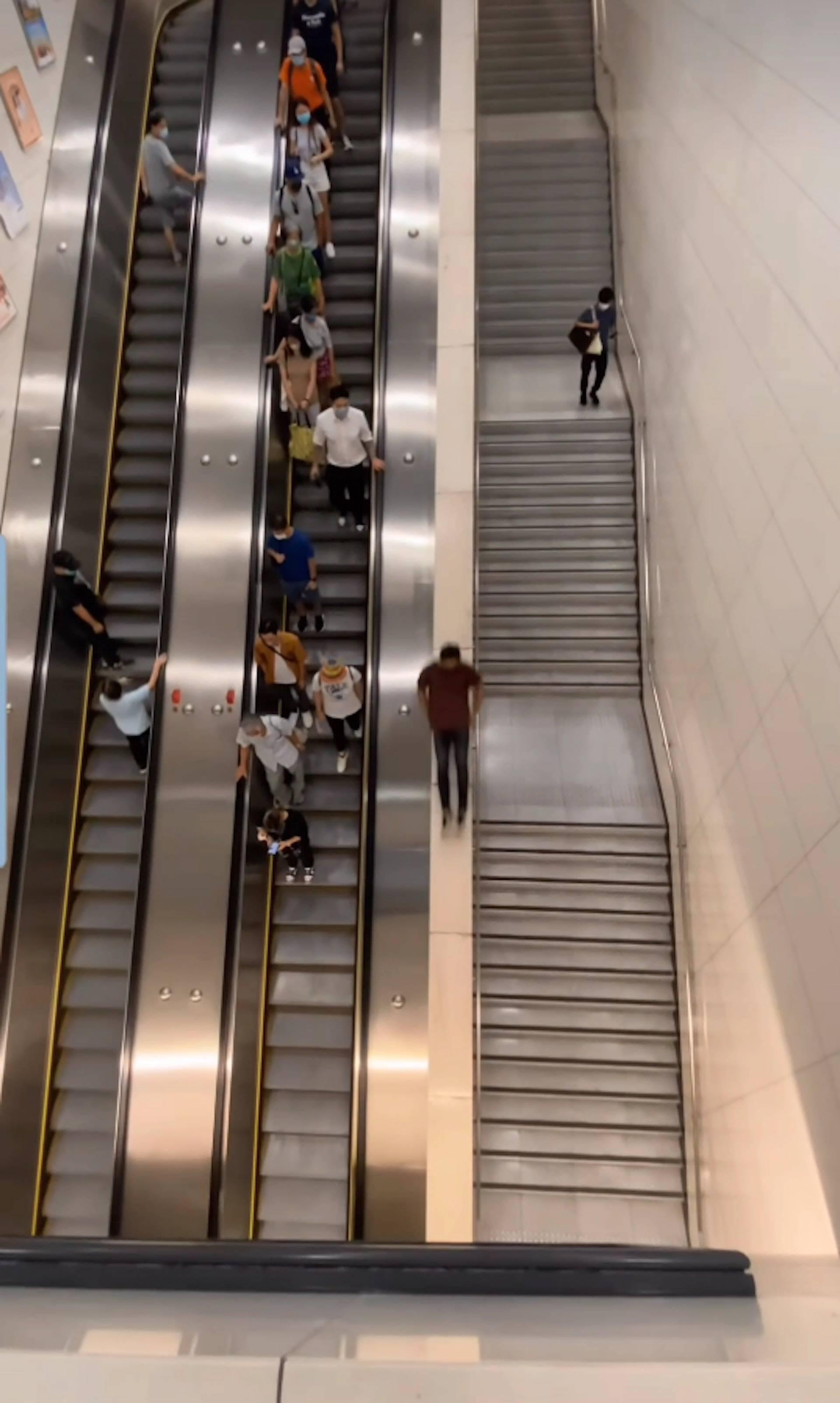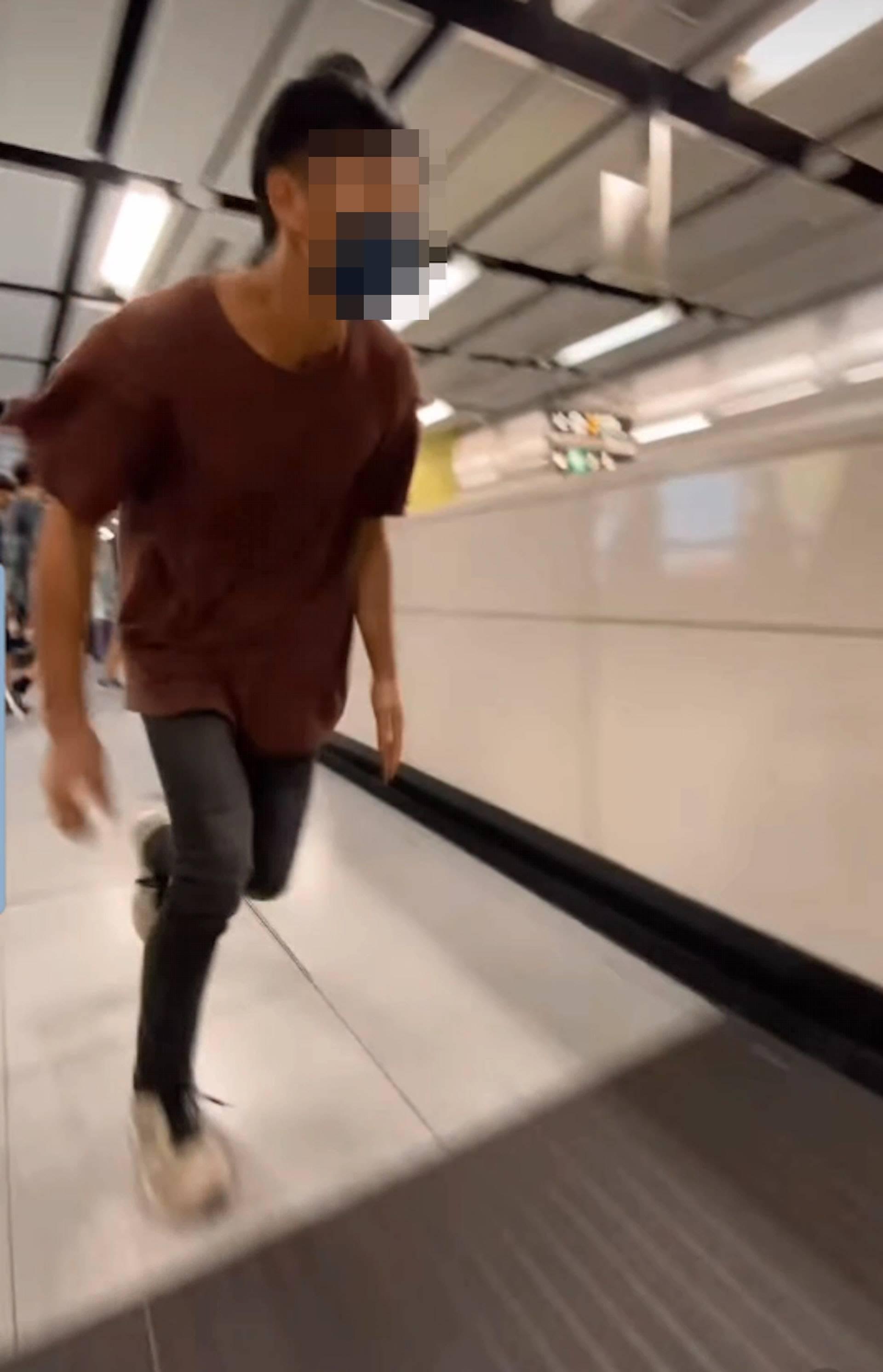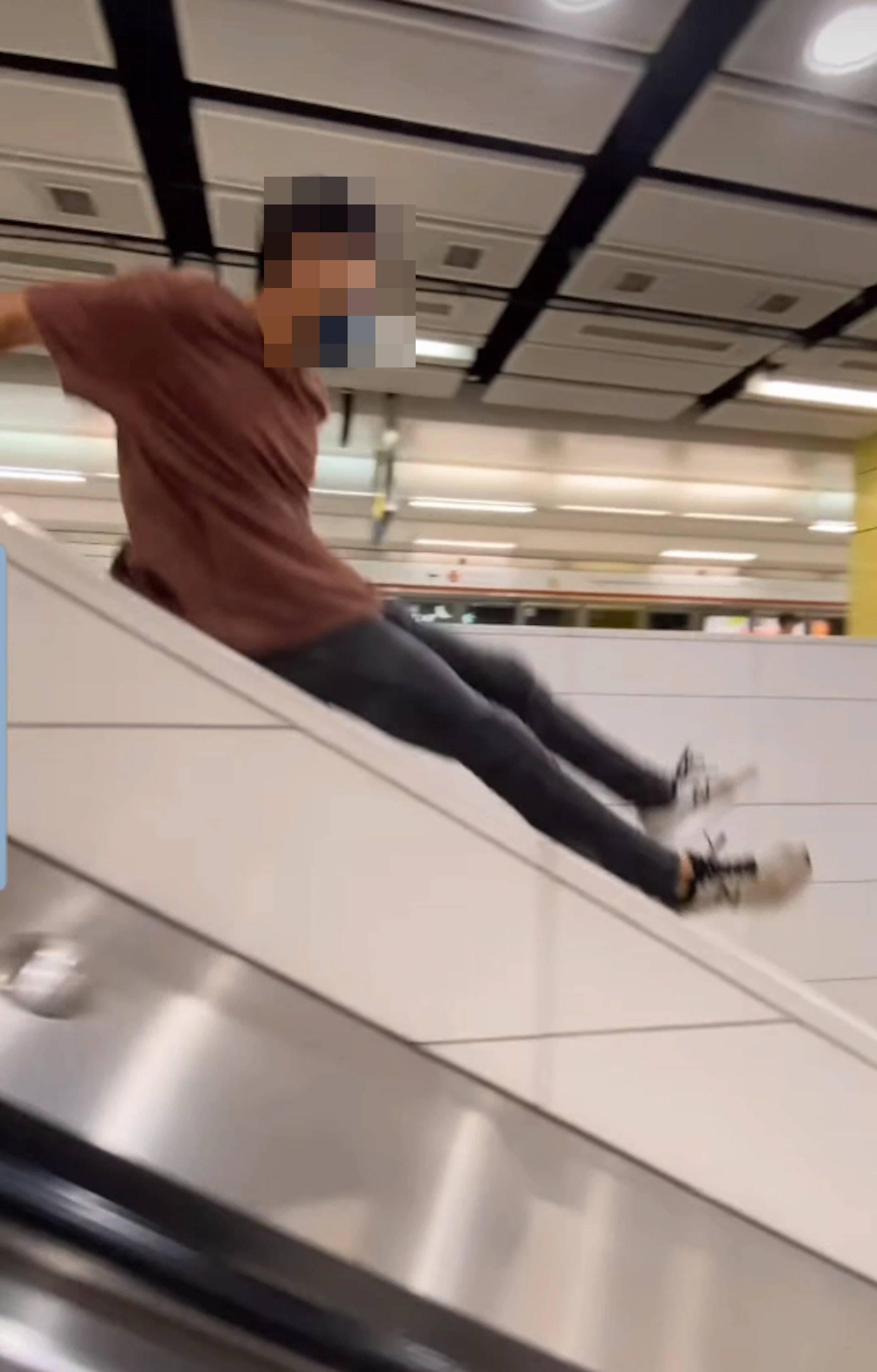 其中一條片段,只見該男子從約2、3層樓,高約10米的扶手梯頂瀡到地面。另一條片段則見,該男子先助跑,然後跳上扶手電梯旁的斜台,然後如瀡滑梯般瀡落地面,到梯台盡頭後跳落地離開,助跑連離開全長不過10秒。,旁邊的途人並無太大反應,近日獲多名網民轉載。